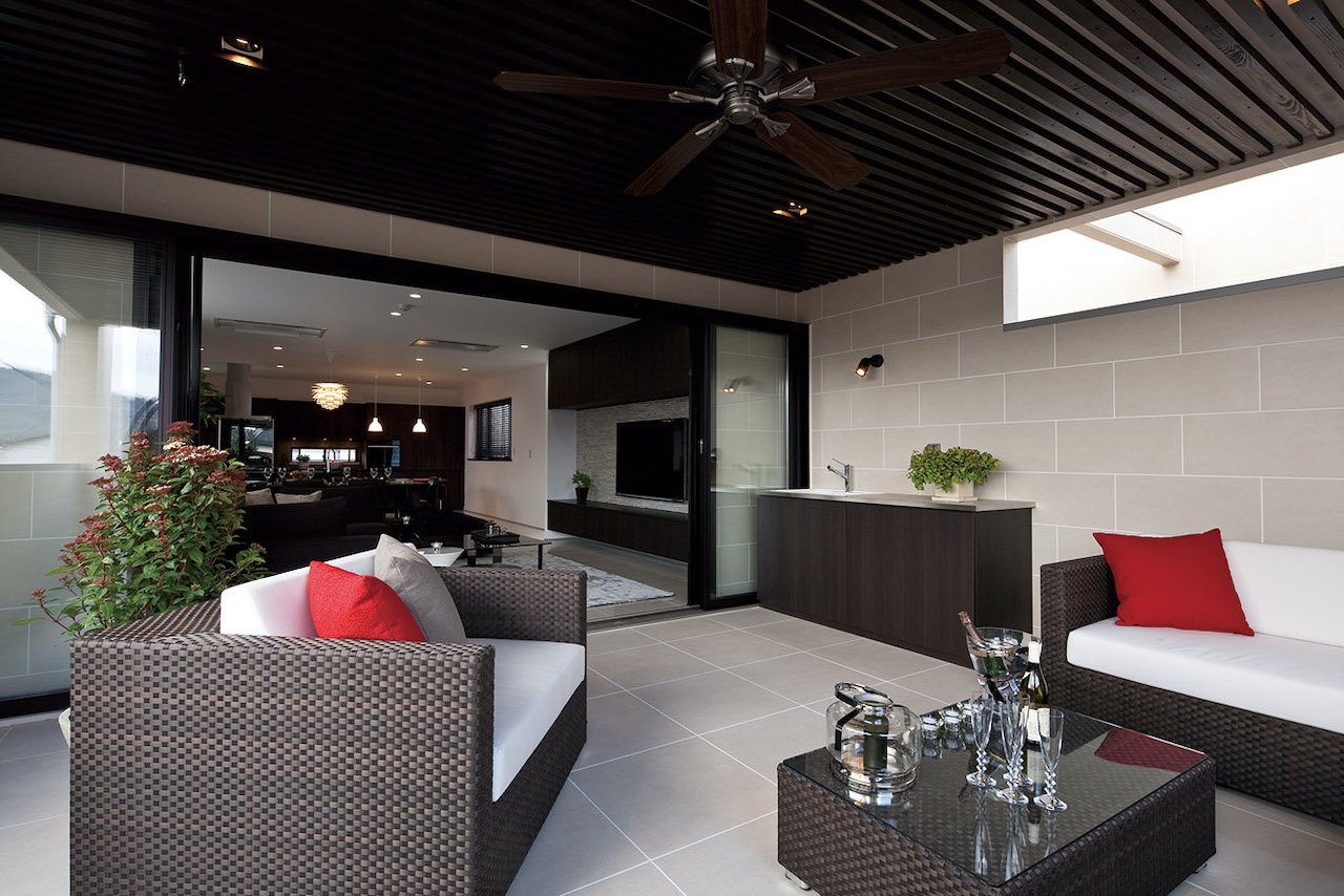 室内リビングに続いて、外にもゆったりとしたアウトドアテラスにもう一つのリビングが広がる住まい。タイルや石、木など自然豊かな質感を持った素材を組み合わせ、非日常空間をつくりあげています。家具は上質な素材とデザインの海外ブランドを厳選。パティオにはシンボルツリーの「桜」を配置、春には花見を楽しめます。外の心地よい空気に包まれながら四季の移り変わりを感じ、自宅にいてもリゾートにいるような寛ぎの得られる、2つのリビングを持つリゾートハウス「桜家」が誕生しました。