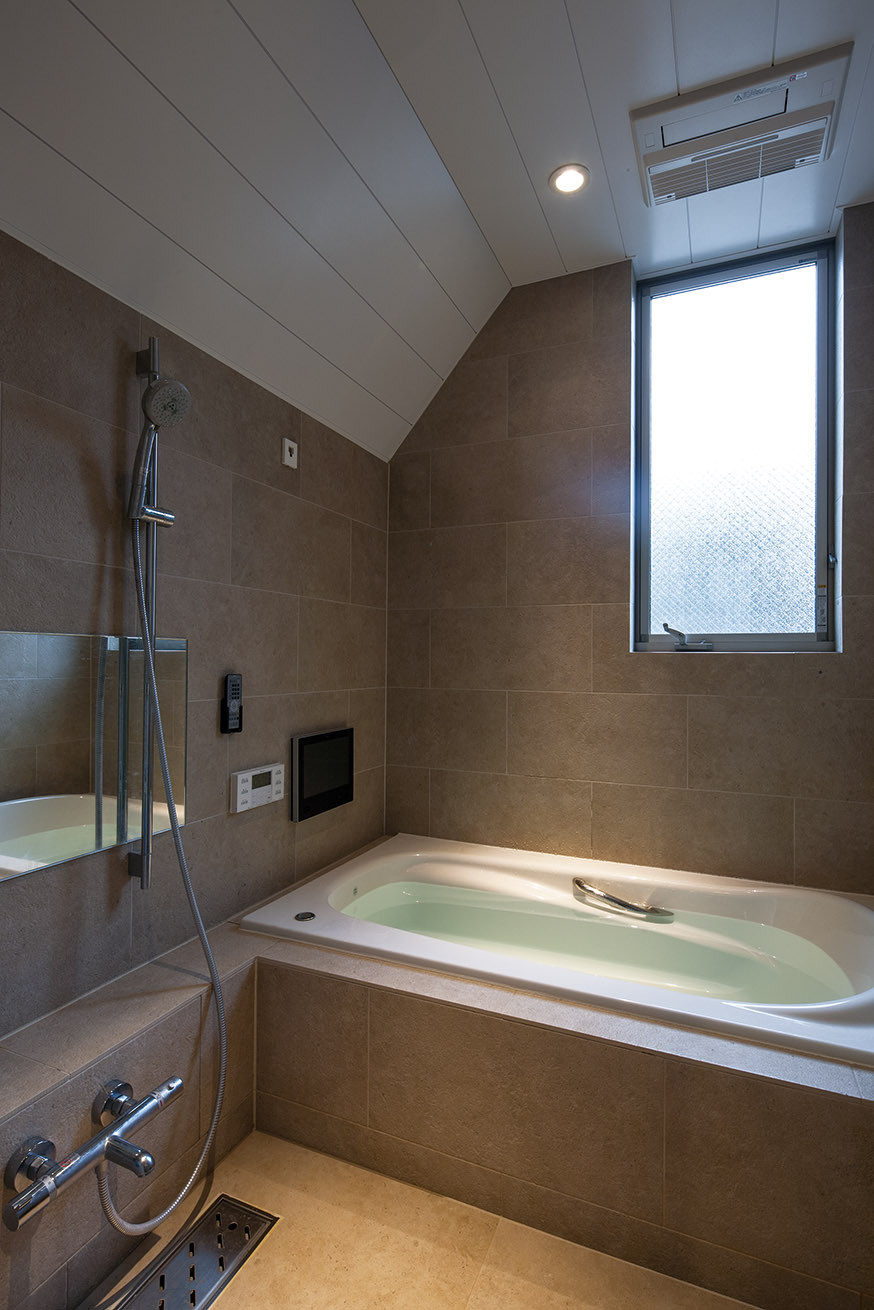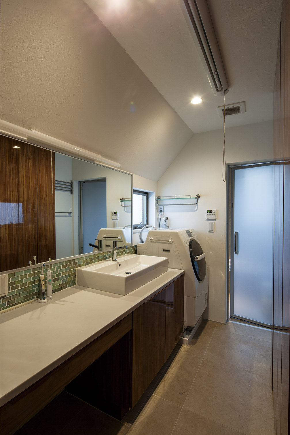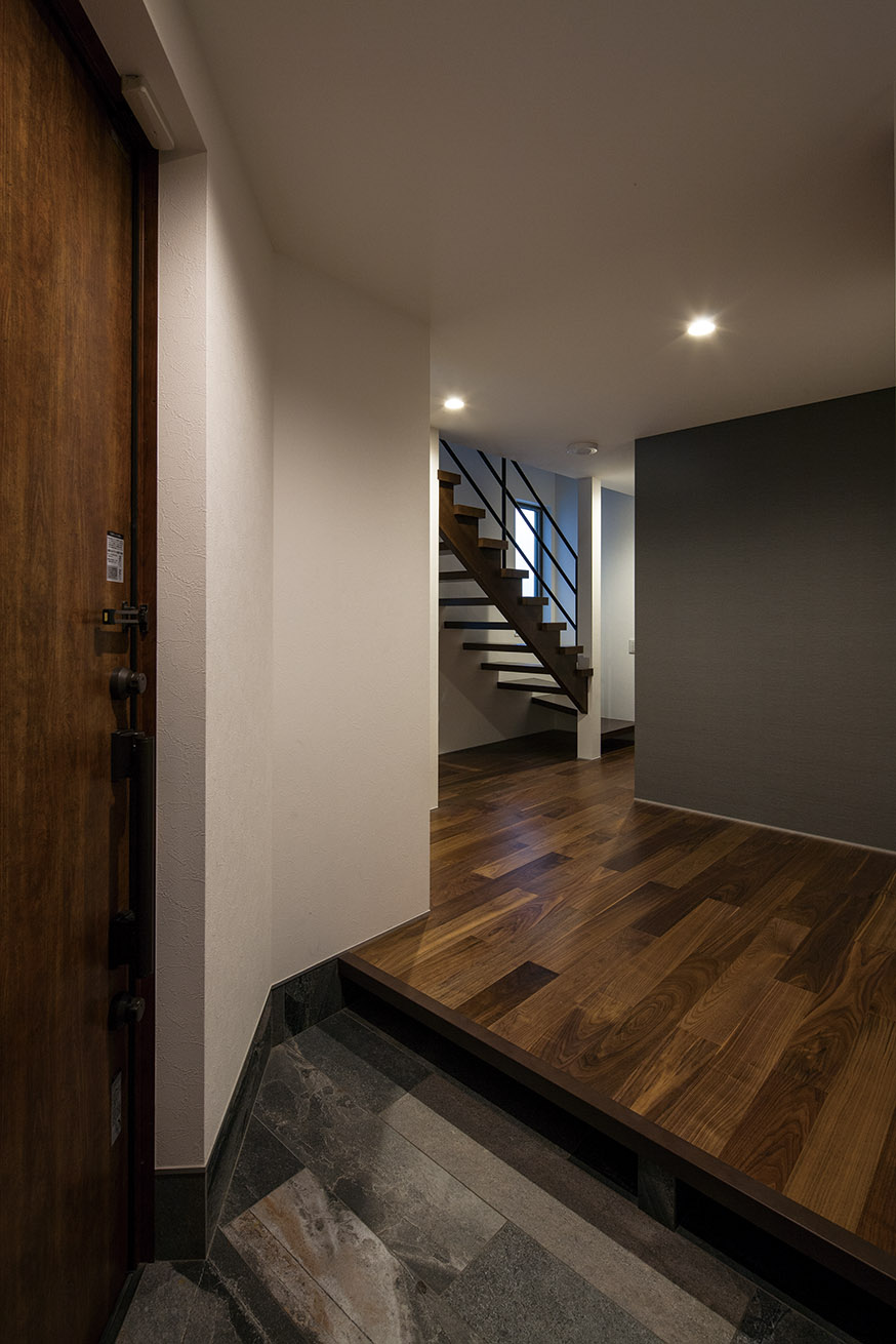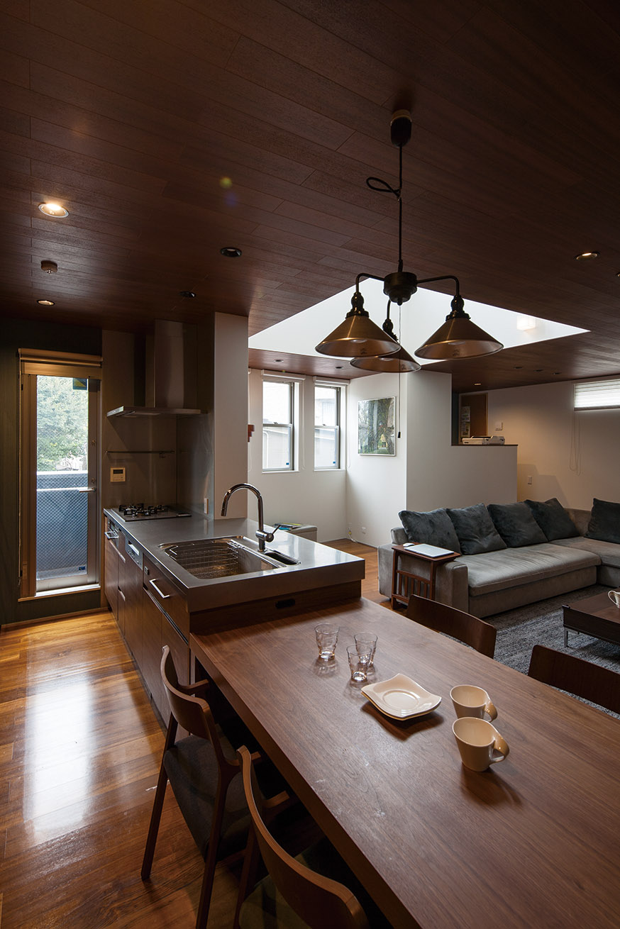 公道から路地でつながる “旗竿地”での計画。土地には「建ぺい率」と呼ばれる規制があり、面積の一定割合は余白として残さなければならない。しかし旗竿地は“竿”に当たる路地部分に余白を集中させたりカレージとして活かすことで、敷地の広さを建物のためにフルに活かすことができる。2階にLDKを確保。壁や天井にも木を使って落ち着いた仕上げとした。抜けのある方向から集中して採光することで、明るい住まいになった。