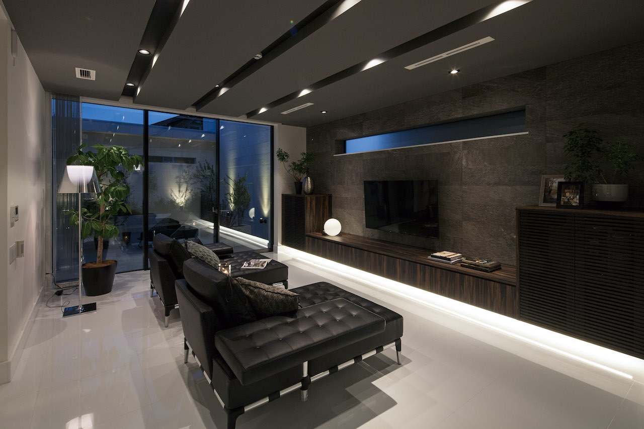 外部からは中の気配はまったく分からないが、2カ所にパティオを設け、さらに「上からの採光」を工夫、「明るく開放的な暮らし」を実現している。外観は曲線のデザインやロートアイアンを使ってクラシックでやさしい表情に、一転して内部は、シャープでモダンな世界を表現した。