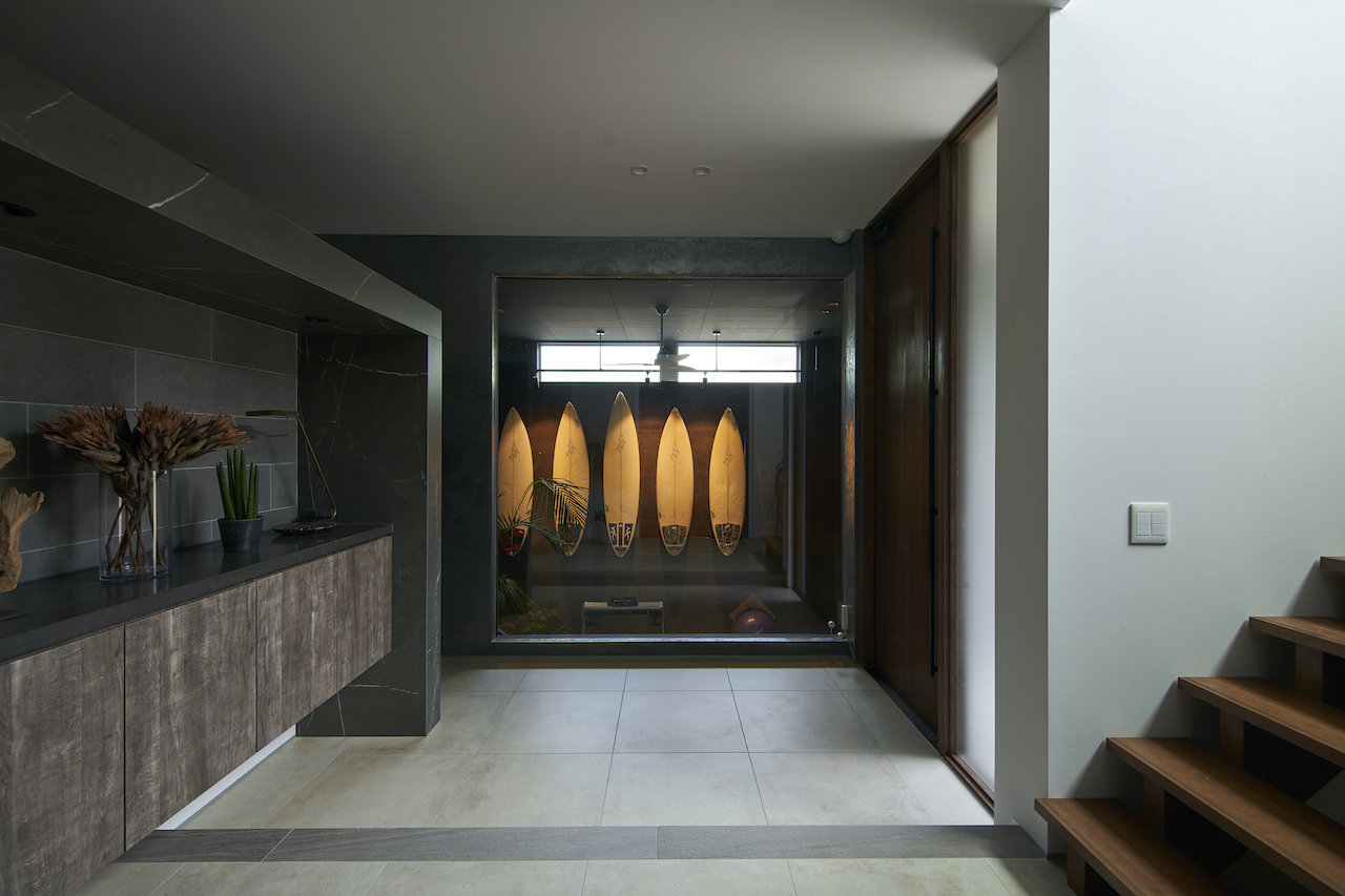 サーフィンを40年以上続けているMさん。湘南の海を見下ろし、その先に伊豆半島と富士山を望む絶景の土地に別荘を建てた。この敷地ならではの眺望を、リビングはもちろん、サウナや浴室など暮らしのあらゆるシーンに取り込んでいる。キッチンはイタリア製。家具と調度品は設計者とMさんがイタリアのミラノに渡りこの家のために選んだ。トータルにデザインされた完成度の高い空間が大きな安らぎをもたらす。