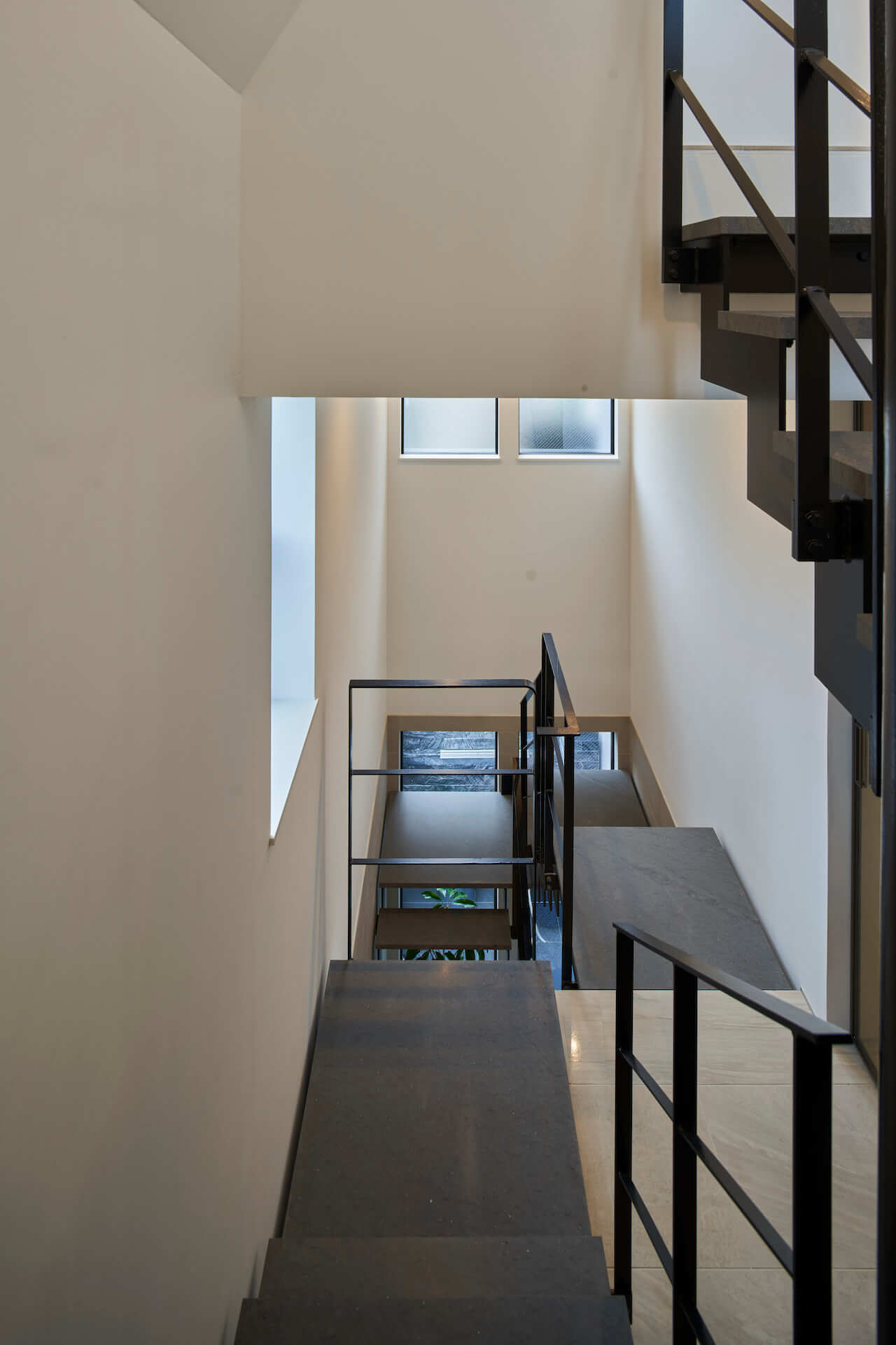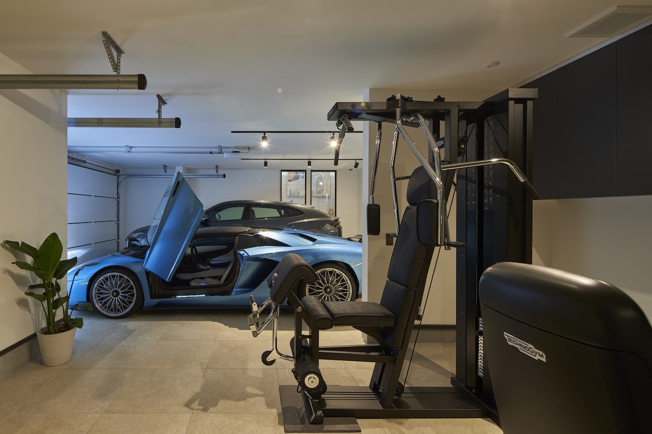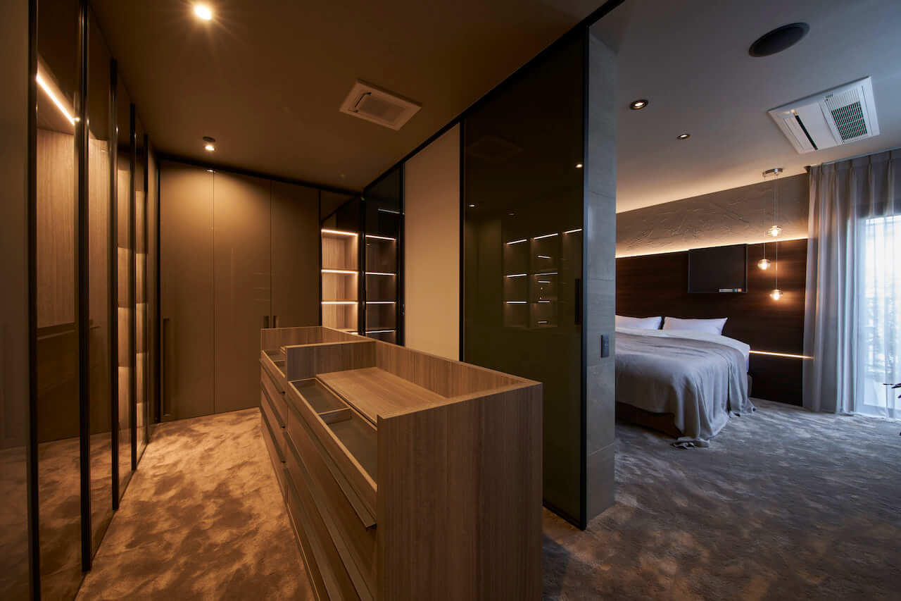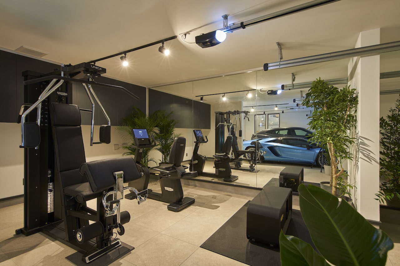 コロナ禍のライフスタイルに対応する、リゾートライフな都市型の住まい。愛車のランボルギーニ2台分のビルトインガレージを囲うように、フィットネスルーム、ゴルフレンジルーム、シアタールームをプラン。エントランス吹き抜け部には、大型のシャンデリアとレジンアートを配置。イタリアの天然石バサルティーナを踏石に使用した階段奥には、水盤および壁泉を配置しました。