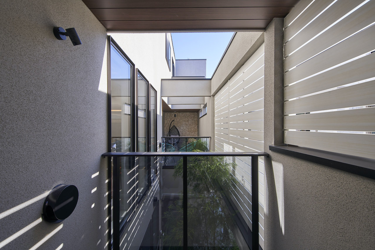 建物一体の目隠し壁で隣接するマンションの視線をカット。