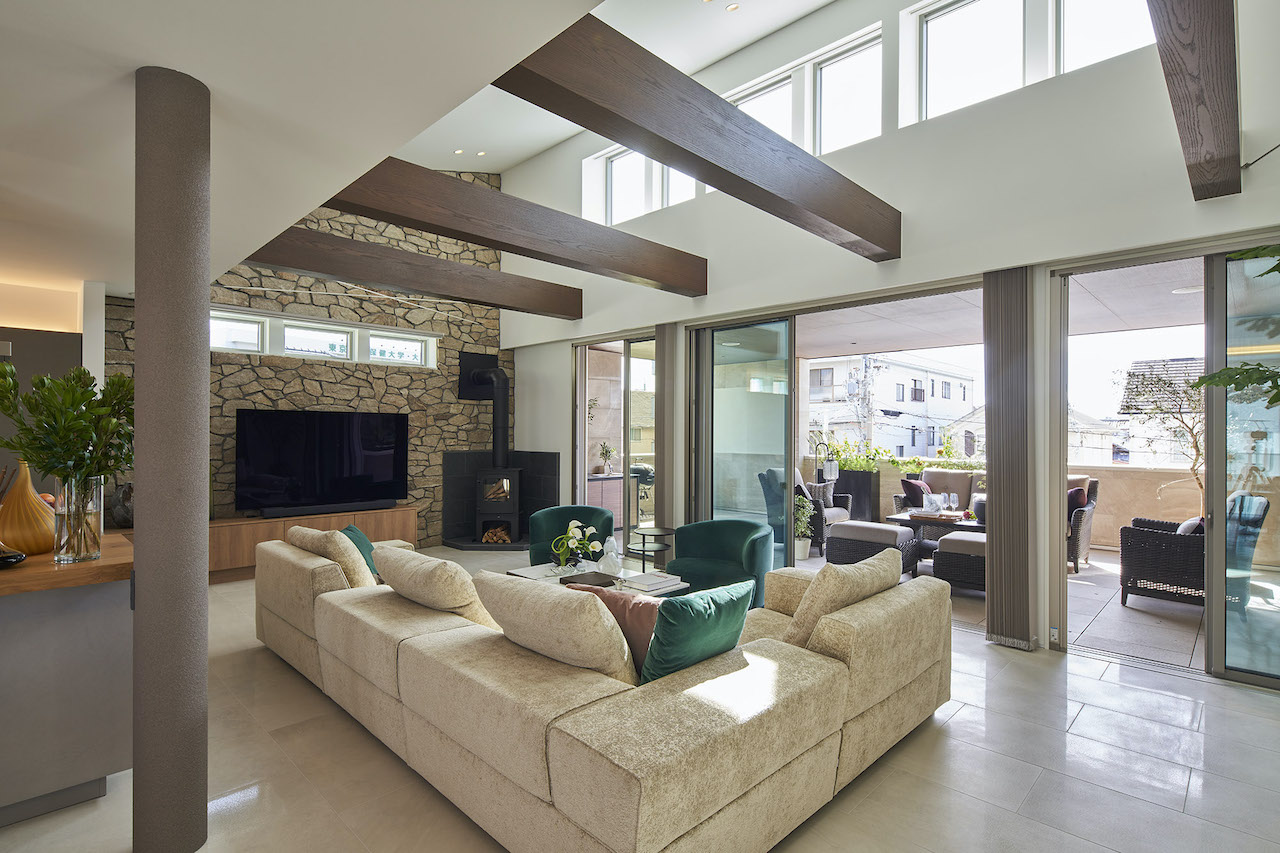 LDKは、縦と横への抜けを演出。勾配天井の吹き抜けに、ハイサイドの連続窓、大きなアウトドアテラスへとつながる大開口がポイント。リゾート感あふれる終の棲家が誕生した。尚、施工会社は大和ハウス。PSDとハウスメーカーのコラボレーションをカタチにした。